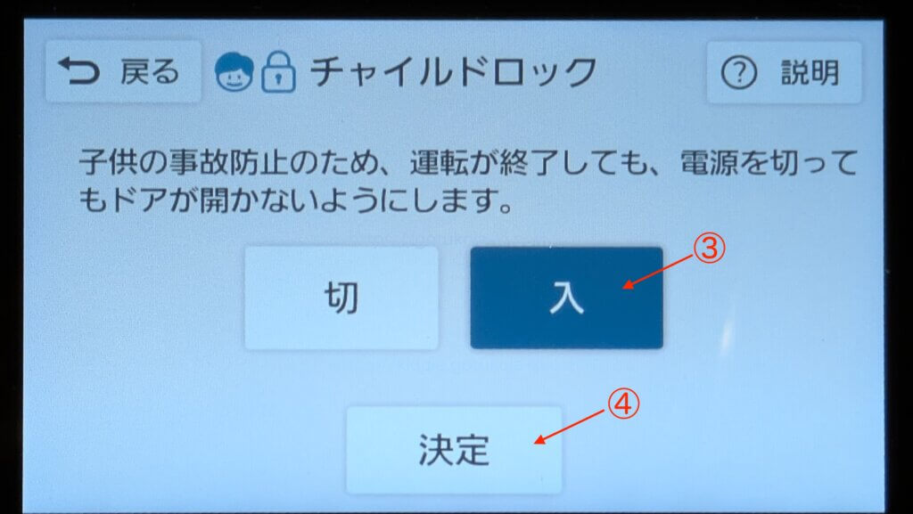 解除するときは、同じ画面を開いて「切」→「決定」でチャイルドロックが解除されドアを開けることができます。