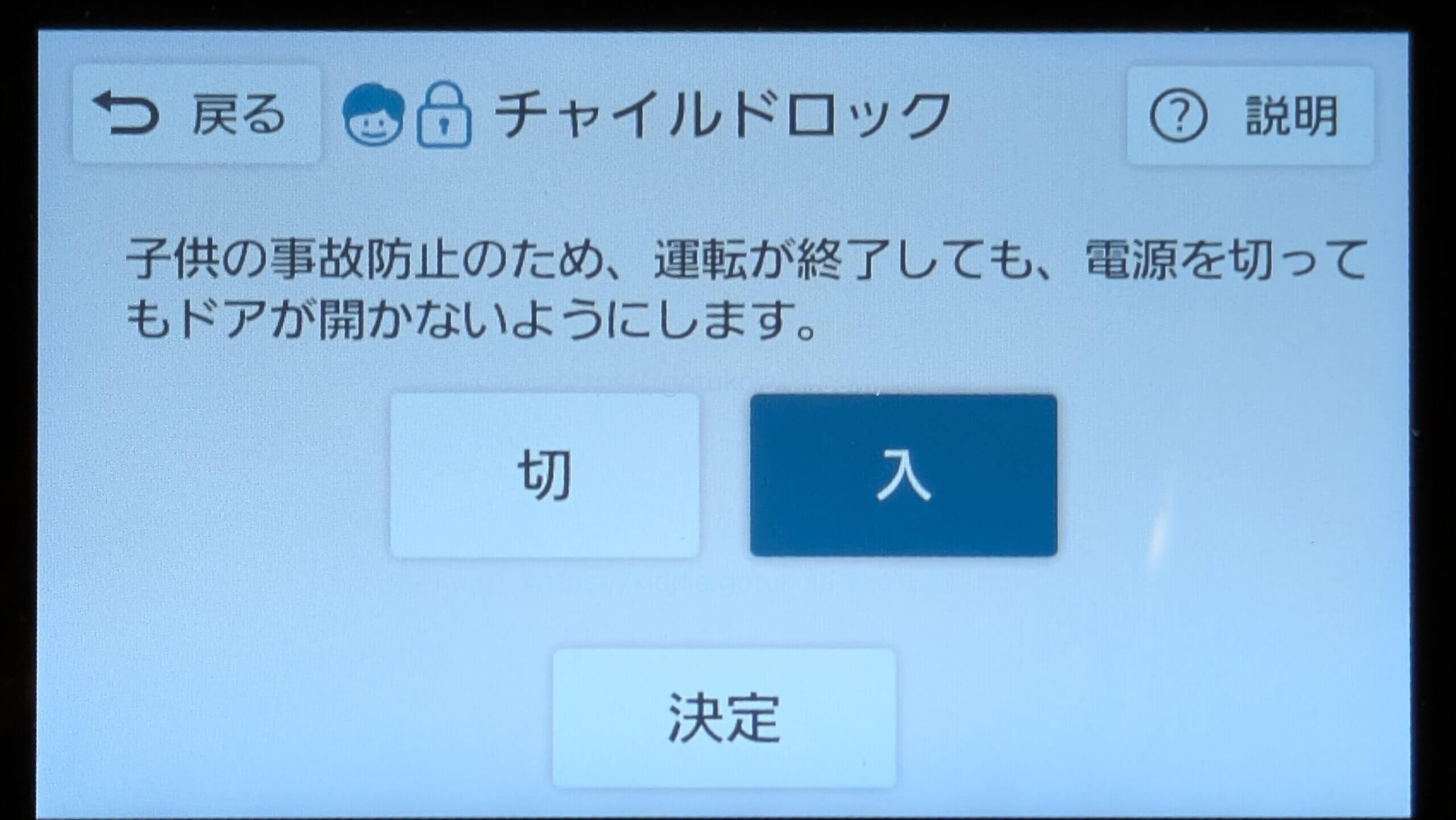 解除するときは、同じ画面を開いて「切」→「決定」でチャイルドロックが解除されドアを開けることができます。